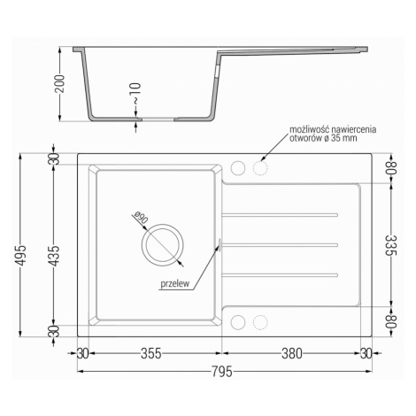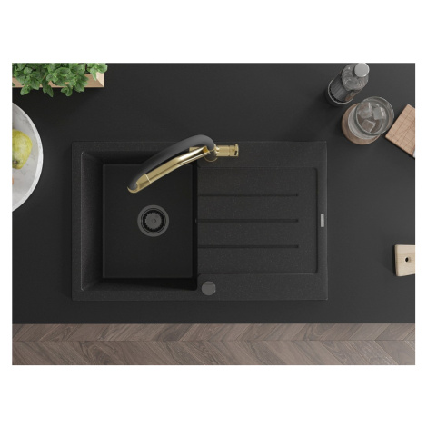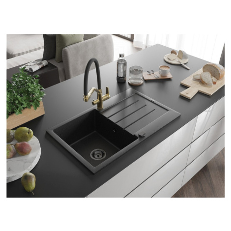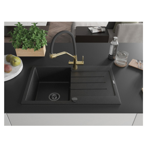 Technické dáta: drez: Rozmer: 795 x 495 x 200 mm Hĺbka komory: 200 mm Rozmery komory: 440x360 mm Priemer odtoku: ø90 mm Typ: 1-miska s odkvapkávačom Typ: Zapustené do pracovnej dosky Farba: čierna/strieborná metalíza Povrchová úprava sifónu: čierna Materiál: žula (80% žulové kamenivo, 20% živice) Prepadový otvor: Áno Otvory: (batérie, automatické) 2 Inštalácia: Univerzálna, je možné inštalovať s odkvapkávačom na ľavú alebo pravú stranu Vysoká odolnosť proti poškriabaniu a zmene farby Odolnosť proti tepelným šokom Ľahko čistiteľný povrch Dva dodatočné vyfrézované otvory na samodierovanie ø35 kuchynská batéria: Materiál: mosadz Farba: Zlatá/Čierna Hlavy: Keramické Prevzdušňovač: Áno Typ hubica: Flexibilný s mosadzným držiakom Rozsah výtoku: 260 mm Výška: 405 mm Typ: Dve rukoväte Dvojhlavá batéria s prídavným filtrom na pitnú vodu(GT) Ean: 5905315102072